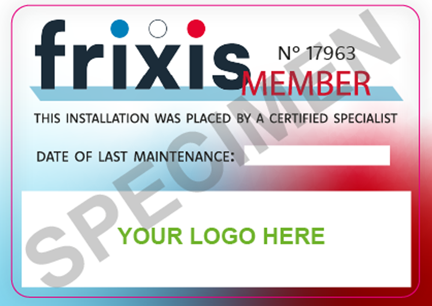 Via deze gepersonaliseerde Frixis – sticker, kan u als koeltechnisch bedrijf aan inspectiediensten en andere partijen aangeven dat de installatie, waarop u de sticker kleeft, volledig reglementair en conform de norm werd geplaatst en wordt onderhouden door een gecertificeerde, ervaren partij.